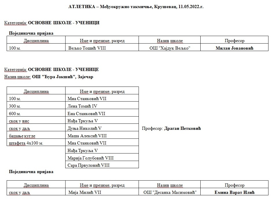 ПОЗНАТИ СВИ УЧЕСНИЦИ МЕЂУОКРУЖНОГ ТАКМИЧЕЊА У АТЛЕТИЦИ