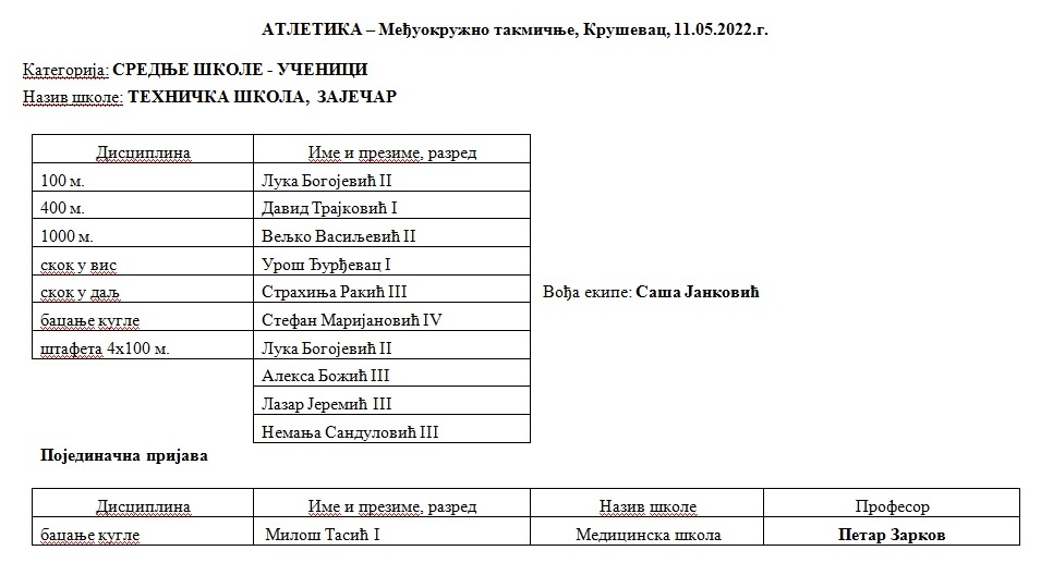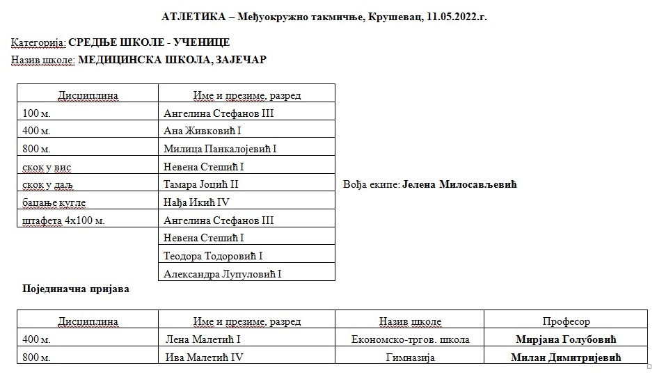 Међуокружно такмичење у атлетици на програму је у среду 11. маја у Крушевцу, а ученици и ученице из Зајечара на челу са својим професорима надметаће се са најбољим појединцима и школским атлетским екипама са територије Расинског, Топличког и Нишког округа.