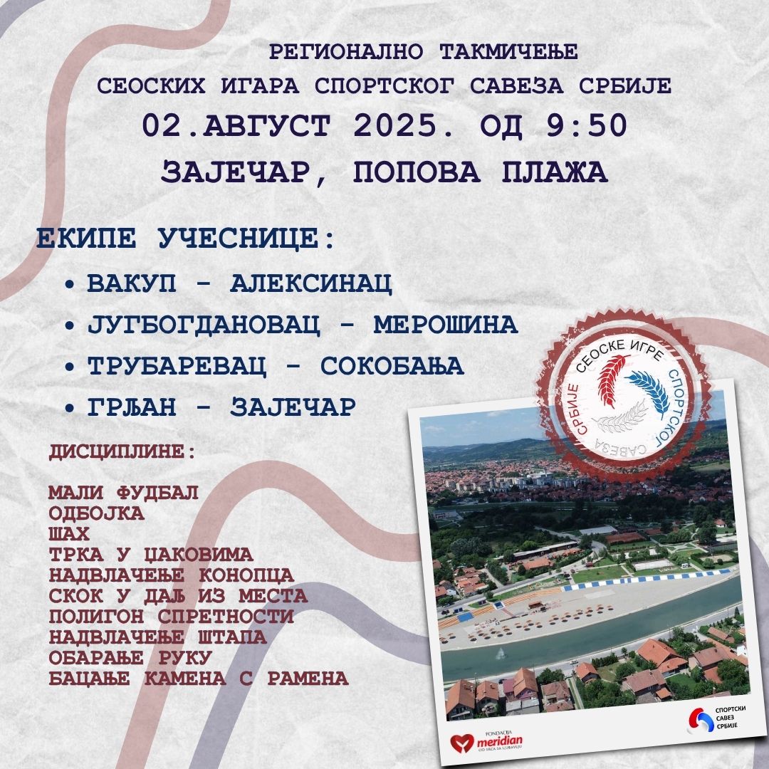 РЕГИОНАЛНО ТАКМИЧЕЊЕ СЕОСКИХ ИГАРА СПОРТСКОГ САВЕЗА СРБИЈЕ У СУБОТУ 2. АВГУСТА У ЗАЈЕЧАРУ