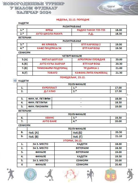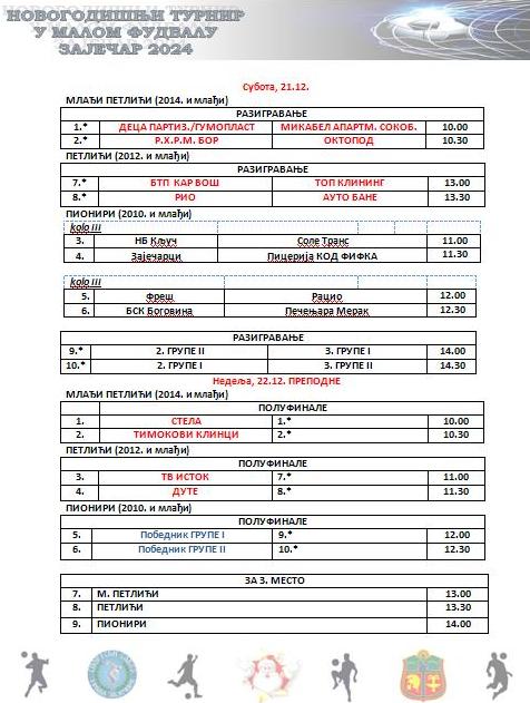 ГЛАС СПОРТА РЕЗУЛТАТИ И НАЈАВА УТАКМИЦА – НОВОГОДИШЊИ ТУРНИР У МАЛОМ ФУДБАЛУ „ЗАЈЕЧАР 2024“ Никола Павловић 21. децембра 2024. Подели Најава утакмица за период од 21. до 24. децембра: