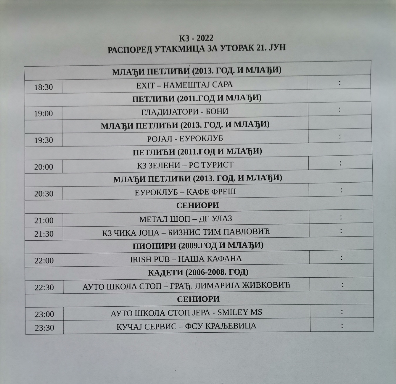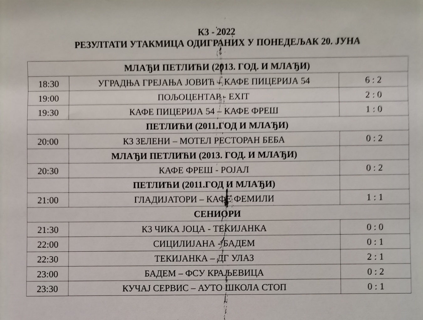РЕЗУЛТАТИ МЕМОРИЈАЛА „ЈОЦА МИХАИЛОВИЋ – К3“ ЗА 20. ЈУН И НАЈАВА ЗА УТОРАК 21. ЈУН