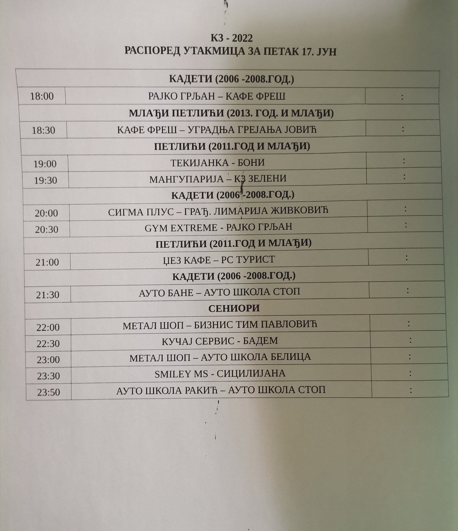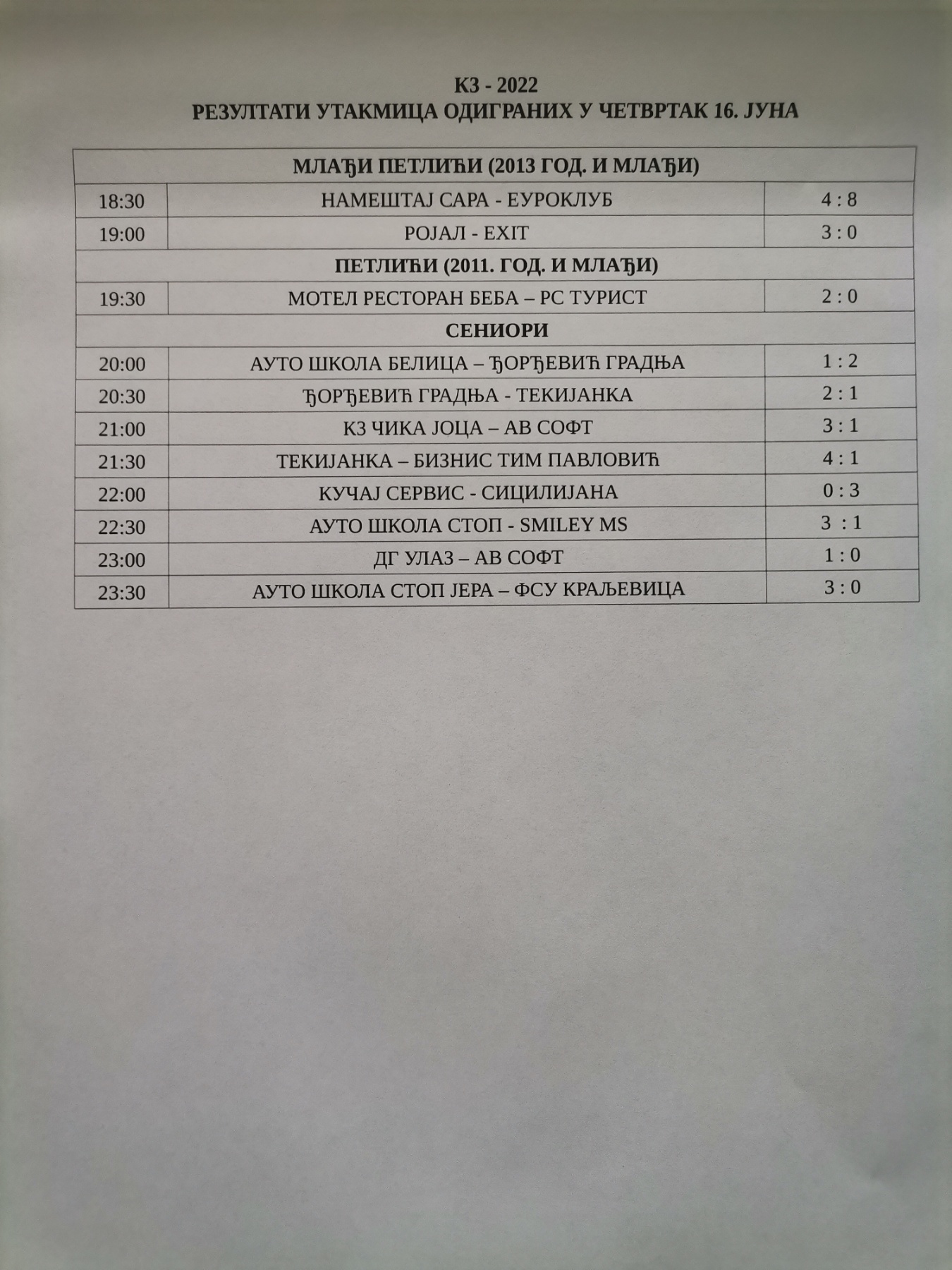 РЕЗУЛТАТИ ТРЕЋЕГ ДАНА МЕМОРИЈАЛА У ЗАЈЕЧАРСКОМ НАСЕЉУ КЉУЧ III И НАЈАВА ЗА ПЕТАК 17. ЈУН