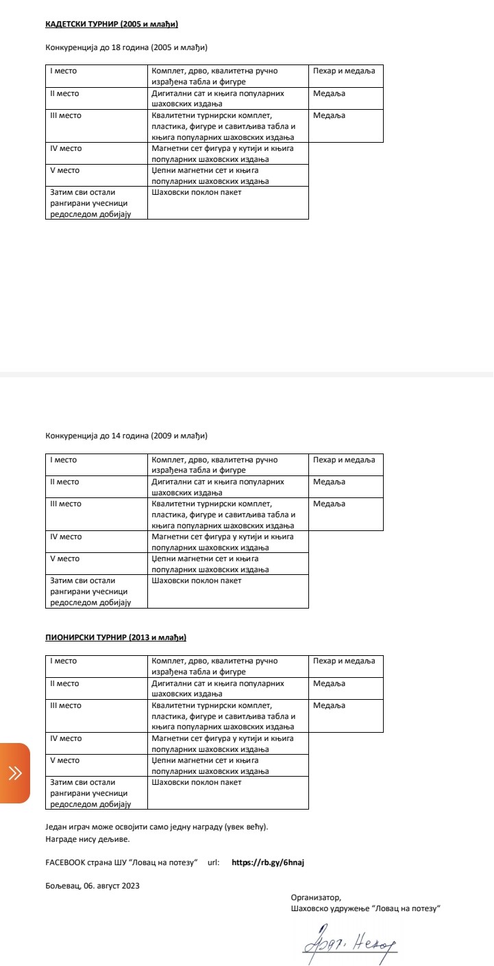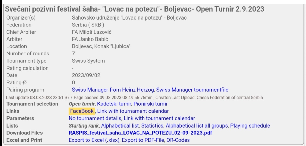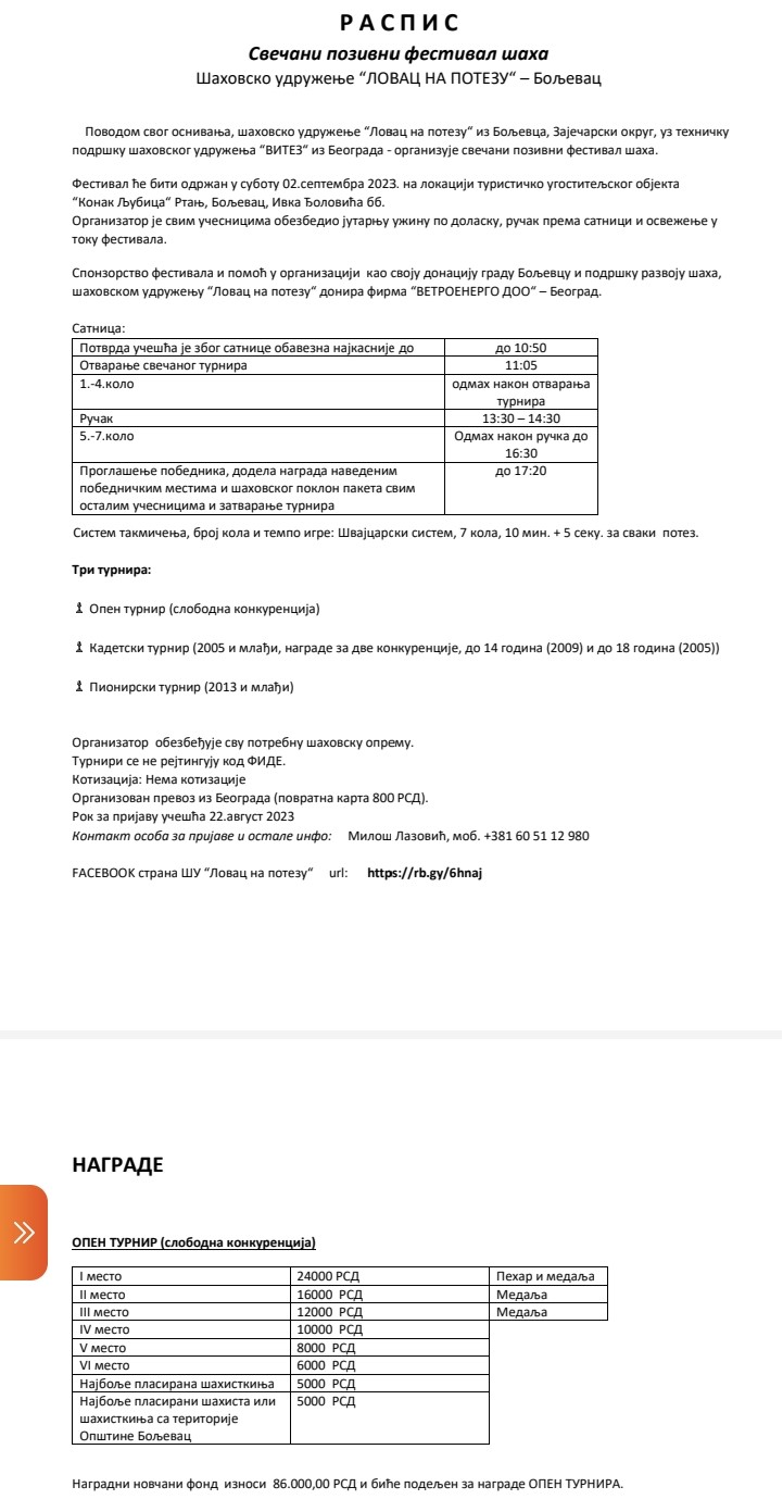 „Поводом оснивања шаховског удружења у Туристичко-угоститељском објекту „Конак Љубица“ организоваћемо Фестивал шаха, који ће надамо се у годинама које следе постати традиционални“, поручили су за „Глас спорта“ из организационог одбора турнира и додали да се све информације могу пронаћи на „Chess results“ странама Фестивала и „facebook“ страници ШУ „Ловац на потезу“.