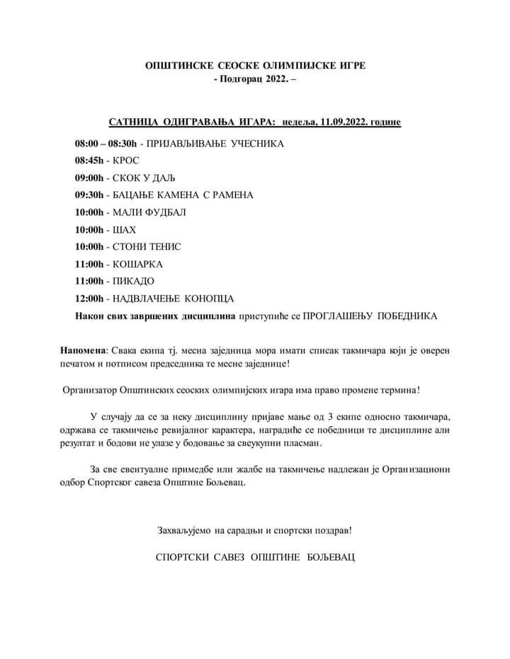 У случају да се за неку дисциплину пријаве мање од 3 екипе односно такмичара, одржава се такмичење ревијалног карактера, биће награђени победници те дисциплине, али резултат и бодови не улазе у бодовање за генерални пласман. За све евентуалне примедбе или жалбе на такмичење надлежан је Организациони одбор Спортског савеза општине Бољевац, наводе организатори.