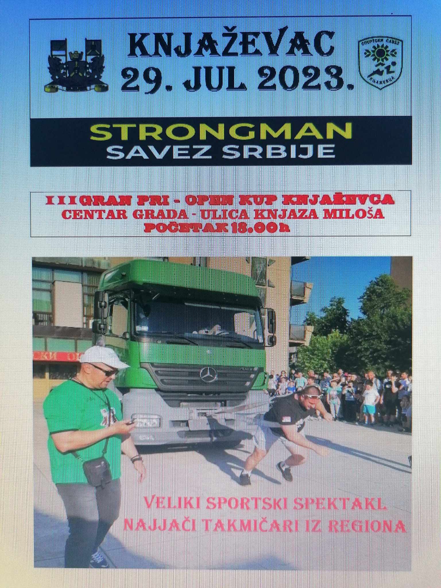Трећи по реду отворени Гранд при куп Kњажевца на програму је 29. јула у центру града на истоку Србије, у улици Kњаза Милоша од каменог моста код маркета „Идеа“ према кружном току. Организатори сада већ традиционалног такмичења су Стронгман савез Србије и Спортски савез Kњажевца, под покровитељством локалне самоуправе и уз техничку подршку Пауерлифтинг и боди билдинг спортског клуба „Kњажевац“.