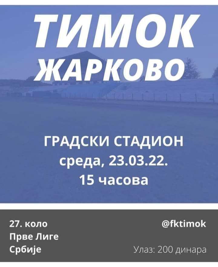 Фудбалери Тимока дочекаће у среду 22. марта екипу Жаркова у једној од најбитнијих утакмица у борби за опстанак у Првој лиги Србије. Зајечарци у дуел против шестопласираног тима табеле улазе осокољени важним тријумфом у Инђији минулог викенда, укупно четвртим везаним на гостовањима.