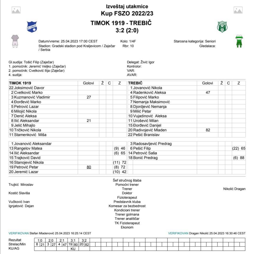 Фудбалери Тимока 1919 савладали су Требич резултатом 3:2 у четвртфиналу Купа Фудбалског савеза Зајечарског округа. Зајечарце су до пласмана у полуфинале погоцима довели Александар Илић у 21., Владимир Кузмановић у 27. и Петар Петровић у 80. минуту, док су стрелци за госте из Сокобање били Марко Филиповић у 47. и Младен Радивојевић у 82. минуту утакмице.
