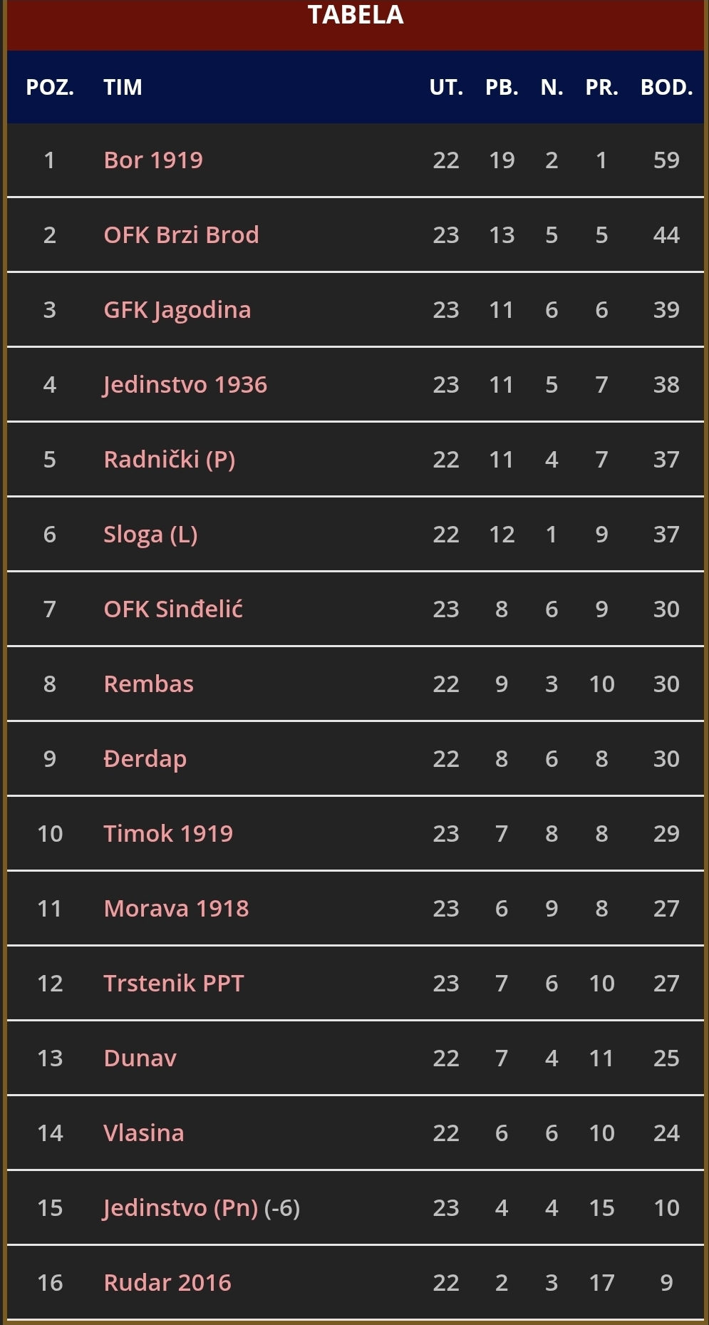 Седмопласирани Рембас је минулог викенда славио у голеади против лидера из Бора са 4:3 и стигао до 33 освојена бода. Синђелић из Ниша и Ђердап из Кладова су 8. и 9. са по 30 бодова, бод мање има Тимок на 10. месту, док су Власина, Морава из Ћуприје и Трстеник сакупили по 27 на деоби 11.,12. и 13. позиције. Своју шансу вреба и Дунав из Прахова са 25 бодова на 14. месту што довољно говори какав галиматијас тренутно влада у Српској лиги „Исток“.