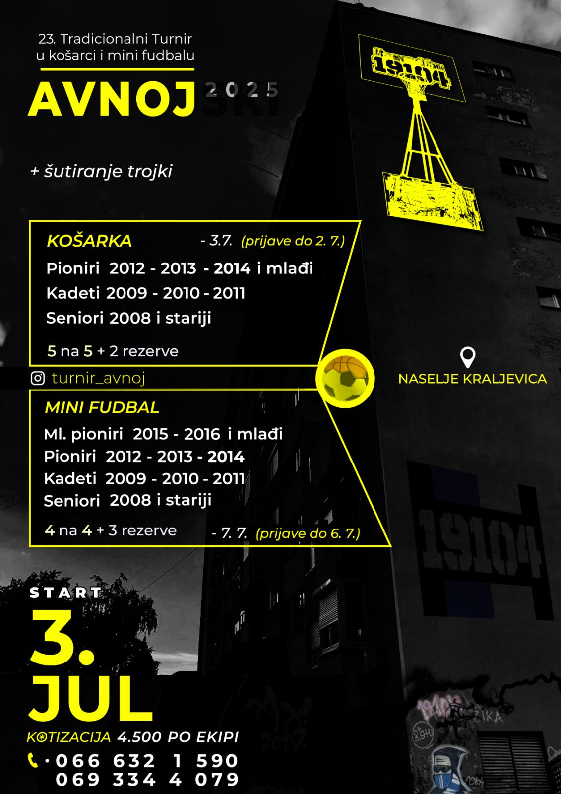 Традиционални турнир у кошарци и мини фудбалу „АВНОЈ 2025” на програму је од 3. јула у Зајечару. Поред стандардних такмичења у кошарци и мини фудбалу, на задовољство како учесника тако и многобројних посетилаца, ту је и такмичење у шутирању тројки, за коју организатори верују да ће бити пун погодак, баш као што је минулих година била и дисциплина 1 на 1.