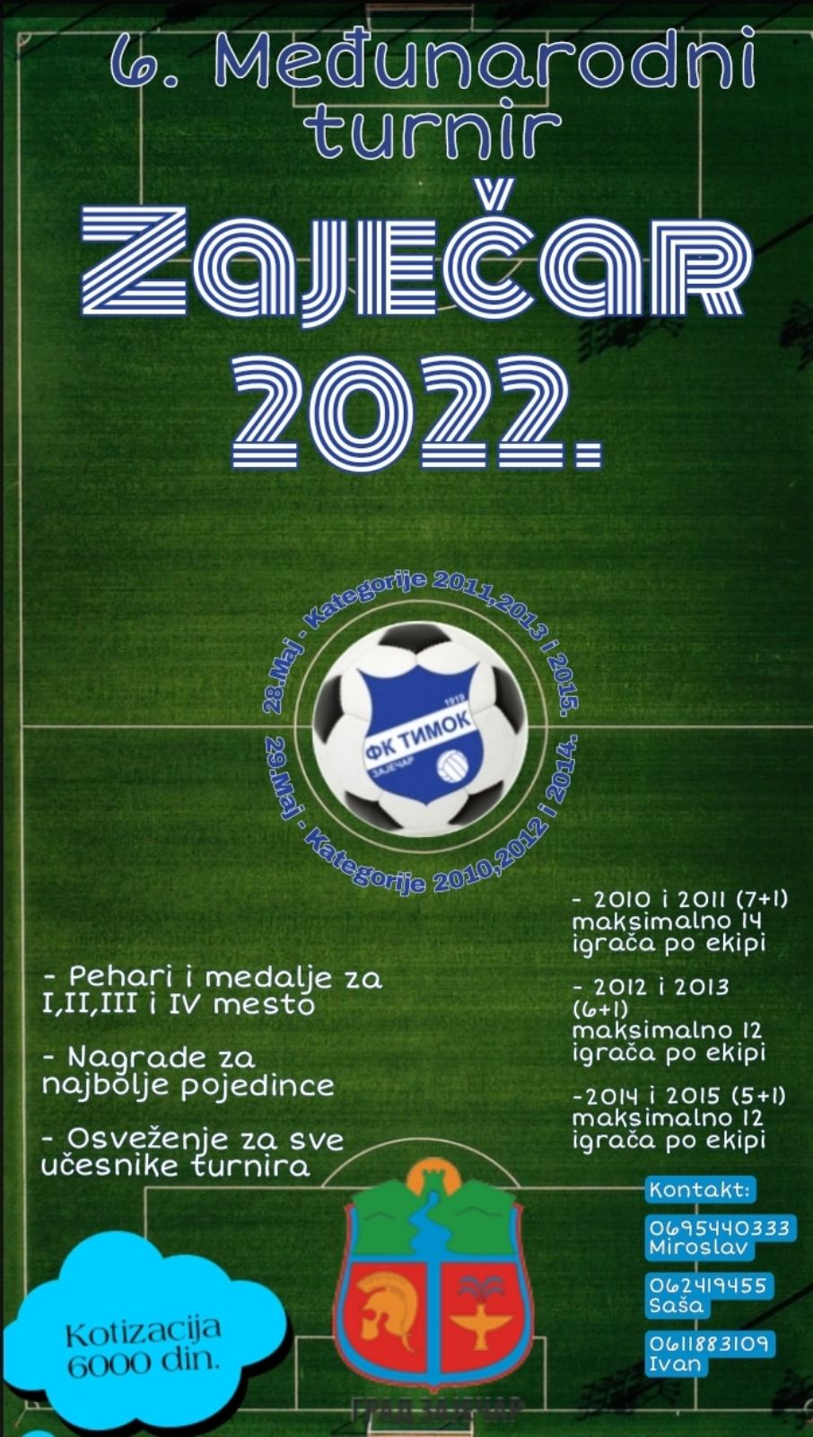 Организатор Међународног фудбалског турнира „Зајечар 2022“ је Фудбалски клуб „Тимок 1919“ уз покровитељство града Зајечара. Првог дана на програму ће бити утакмице малих фудбалера рођених 2011.,2013. и 2015. године, док ће другог дана своје мечеве играти генерације 2010., 2012. и 2014.