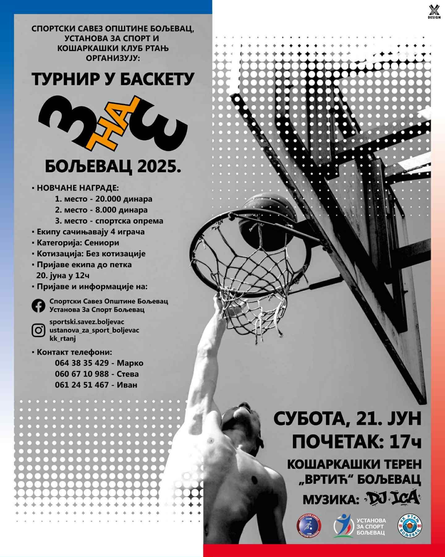 Турнир у баскету 3 на 3 „БОЉЕВАЦ 2025“ на програму је 21. јуна на кошаркашком терену „Вртића“ у Бољевцу. Организатор је Спортски савез Општине Бољевац уз подршку Установе за спорт и Кошаркашког клуба „Ртањ“ и покровитељство општине Бољевац,