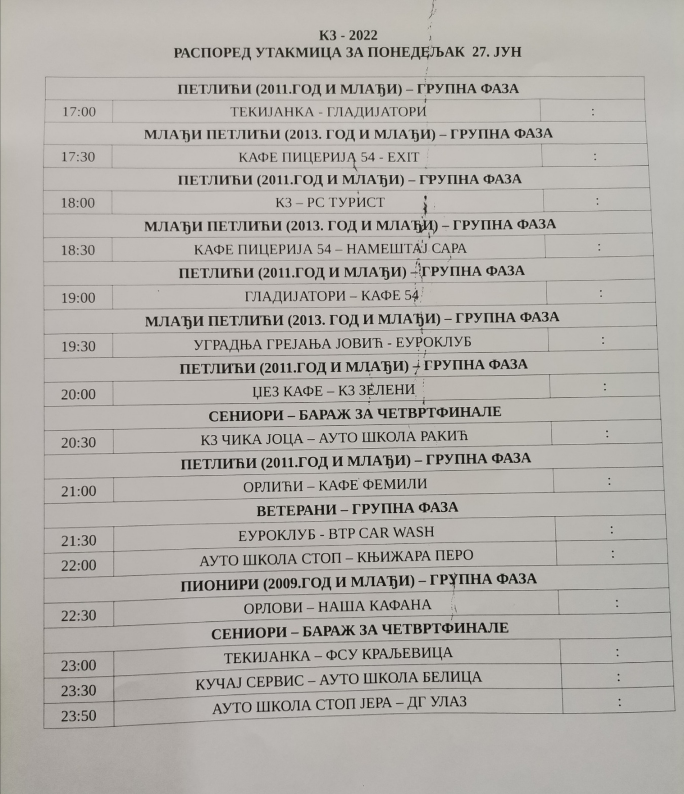 Већ у понедељак 27. јуна на програму је 15 утакмица, после којих ће неке ствари бити јасније на Меморијалном турниру „Јоца Михаиловић – К3“ у зајечарском насељу Кључ III. Ево и свих парова: