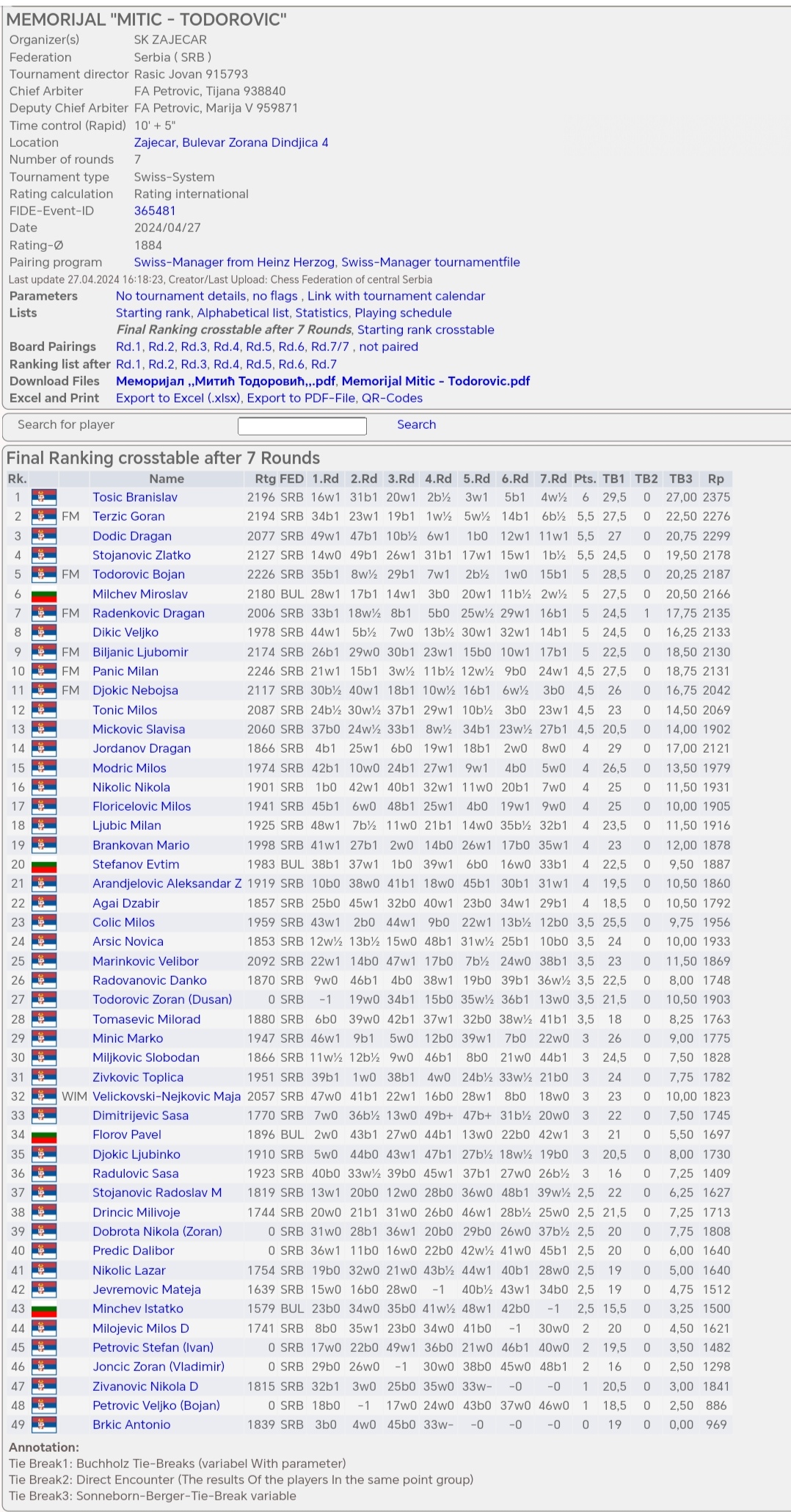 Меморијал „Митић-Тодоровић“, посвећен дугогодишњим играчима, капитену и председнику Шаховског клуба „Зајечар“ одржан је у суботу 27. априла у Зајечару, у сали угоститељског објекта „Опа Ђурђо“. Трећи по реду меморијални турнир окупио је на крају 50 учесника, а прво место освојио је Зајечарац Бранислав Тошић, испред другопласираног фиде мајстора Горана Терзића из Ниша и Драгана Додића из Бора, који је у јакој конкуренцији стигао до 3. места.