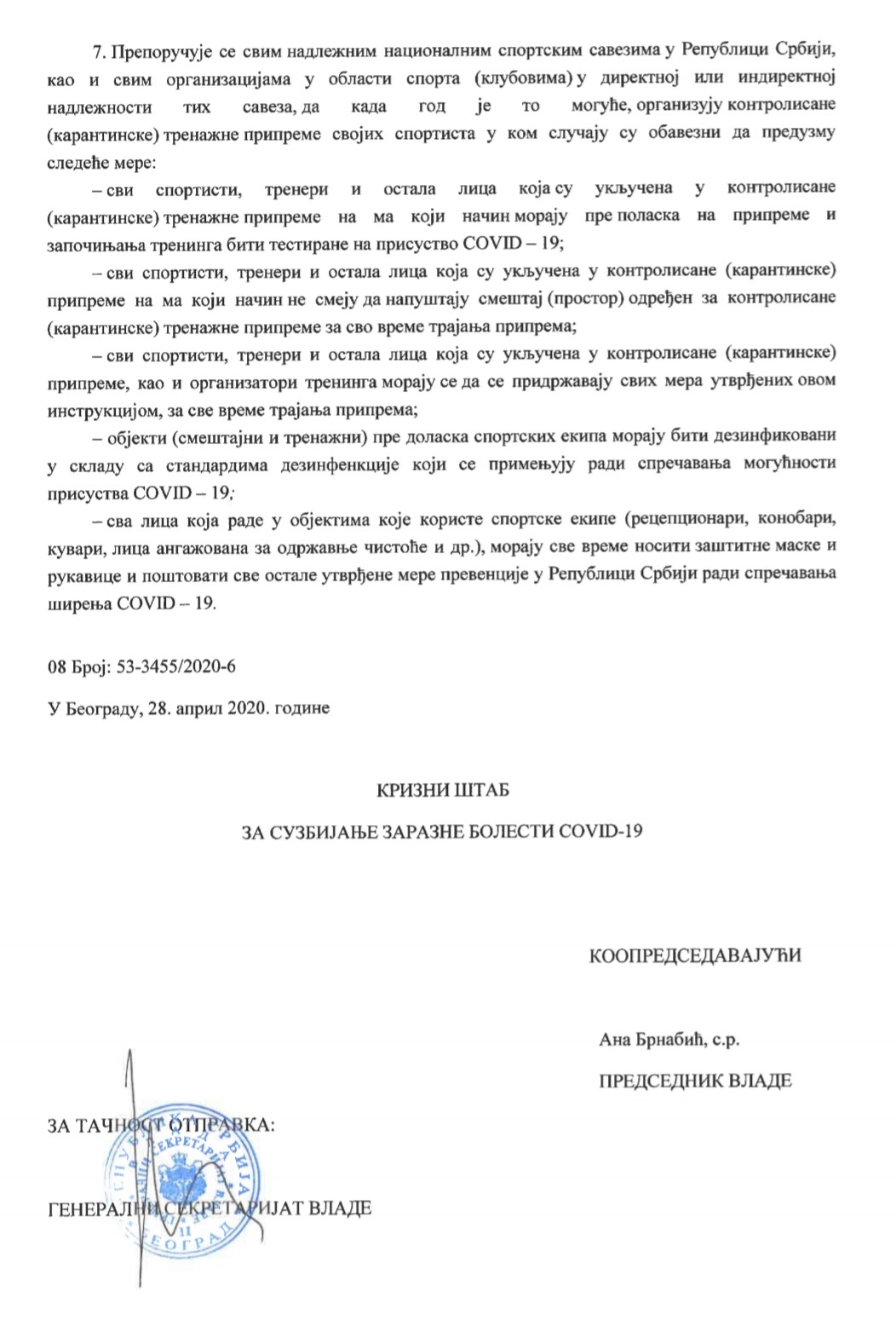 Препоручује се свим националним спортским савезима и клубовима да када год је то могуће организују контролисане (карантинске) тренажне припреме својих спортиста.