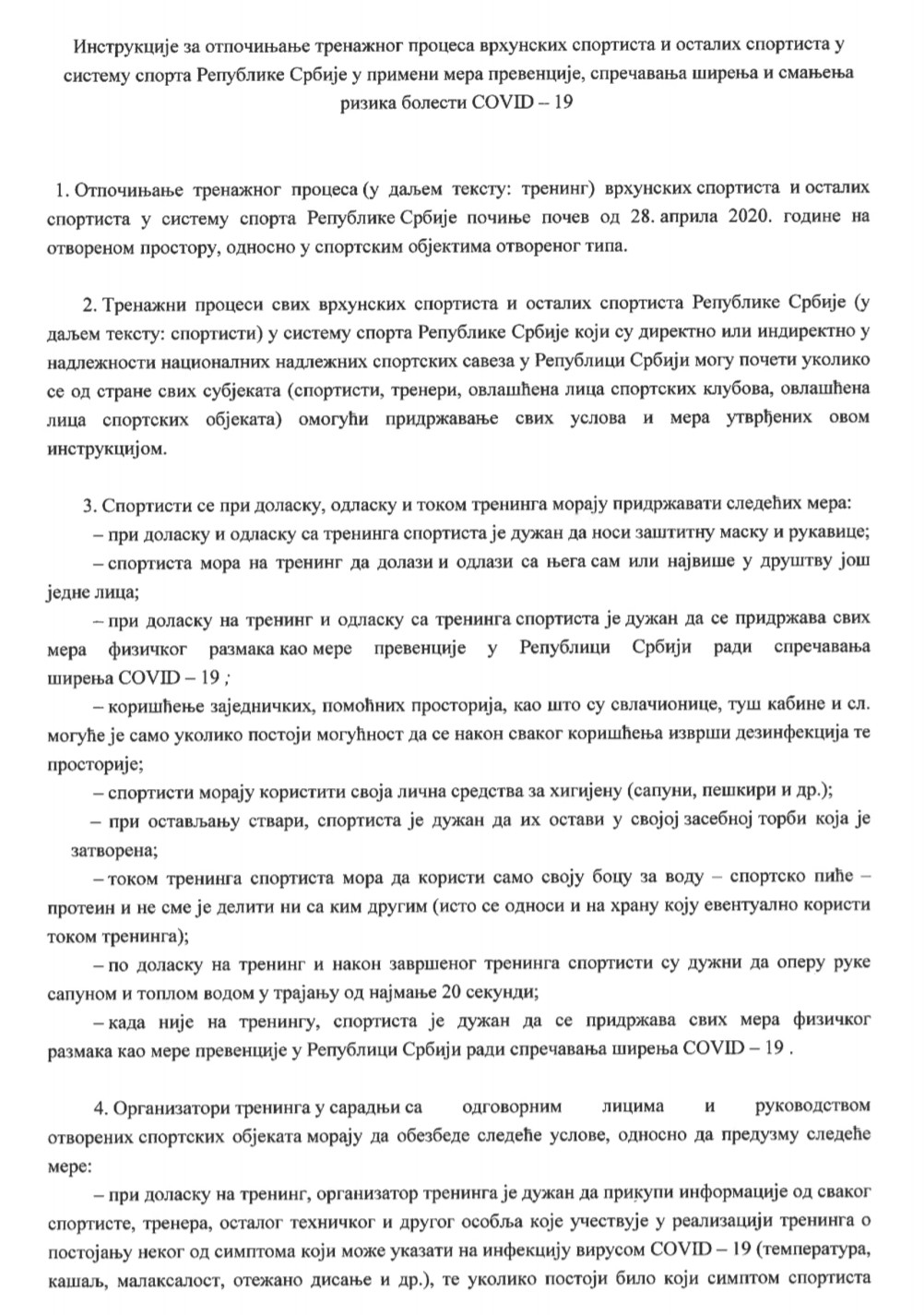 УСЛОВИ ЗА ОТПОЧИЊАЊЕ ТРЕНИНГА – МИНИСТАРСТВО СПОРТА САОПШТИЛО ИНСТРУКЦИЈЕ