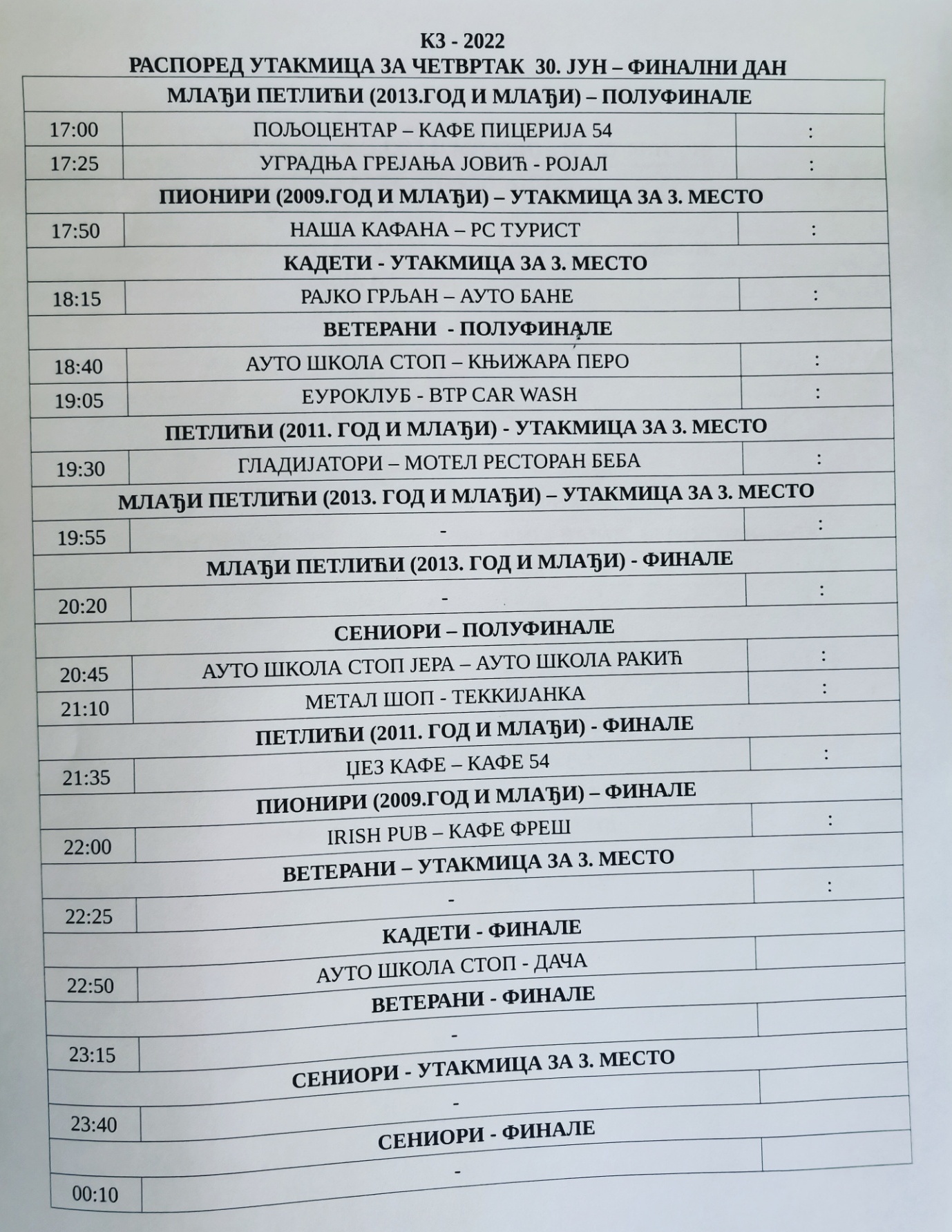Сјајни мечеви на распореду су последњег дана Меморијала, пошто ће се на терену наћи само најбољи од најбољих. Полуфинаисти и финалисти турнира у категоријама млађих петлића, петлића, пионира, кадета, али и ветерана и сениора одмериће снаге на терену у Котлујевцу, а најуспешнији ће кући понети и вредне награде. На програму је чак 17 утакмица, а публика ће заиста моћи да ужива у најузбудљивијим мечевима у свих шест категорија.