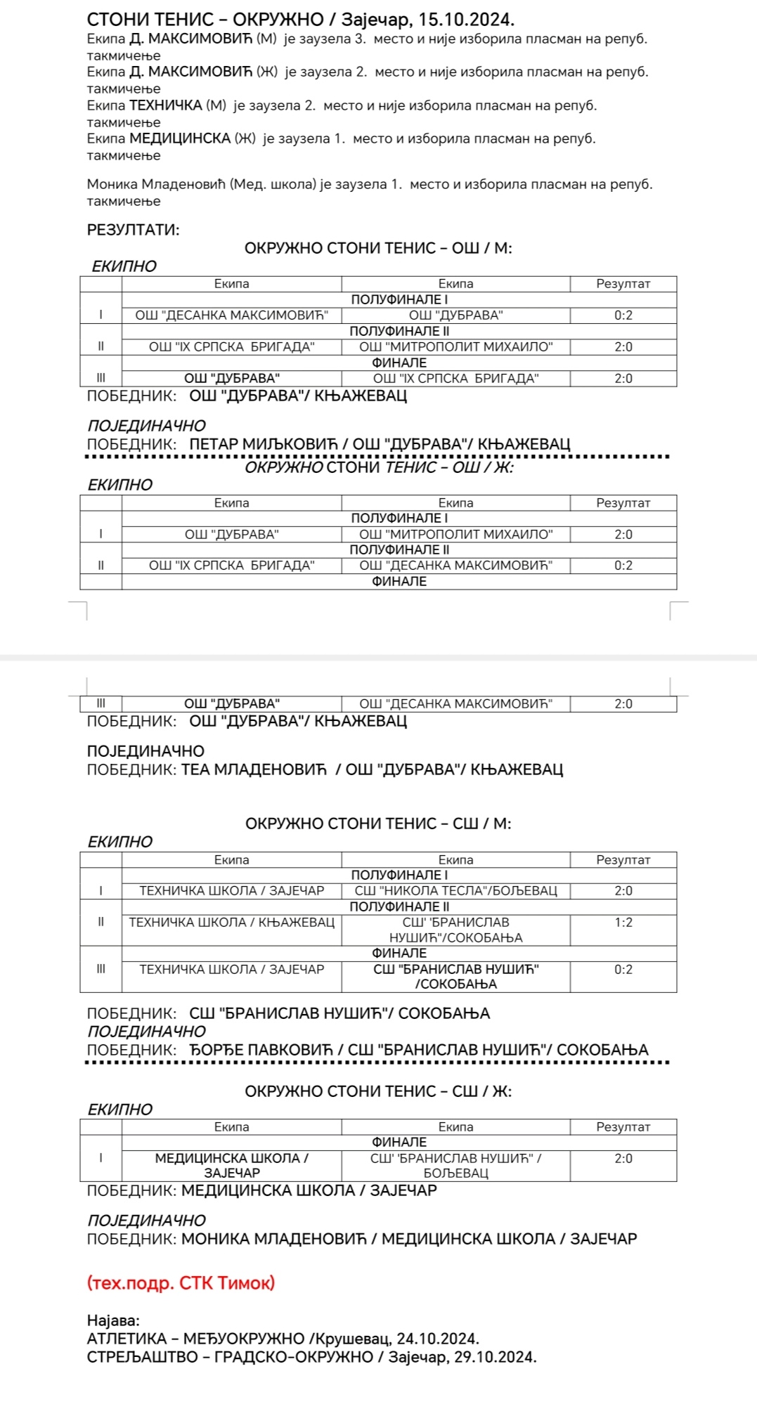 Окружно такмичење у стоном тенису за ученике основних и средњих школа, одржано је у уторак 15. октобра у хали спортова на Краљевици.  Зајечарски савез за школски спорт (ЗШС) организовао је два надметања у току претходне недеље, а велику подршку у организацији пружио је Стонотениски клуб „Тимок“, чији су чланови делили правду на такмичењу са кога су најуспешније екипе и појединци изборили пласман на Републичко такмичење. Тамо ће част Зајечара бранити ученице Медицинске школе у екипној и Моника Младеновић у појединачној конкуренцији.
