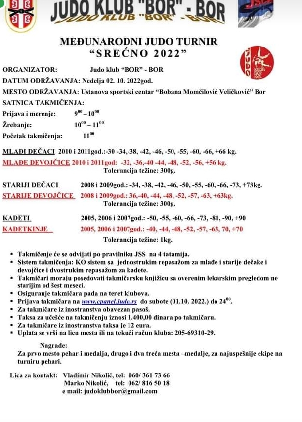 У Џудо клубу „Бор“ се полако спремају за Међународни џудо турнир „Срећно 2022“, који је на програму 2. октобра у Бору. Представници једног од најуспешнијих борских спортских клубова најављују прави џудо спектакл првог викенда октобра, који ће окупити најбоље младе такмичаре узраста од 10 до 17 година из Србије и региона.