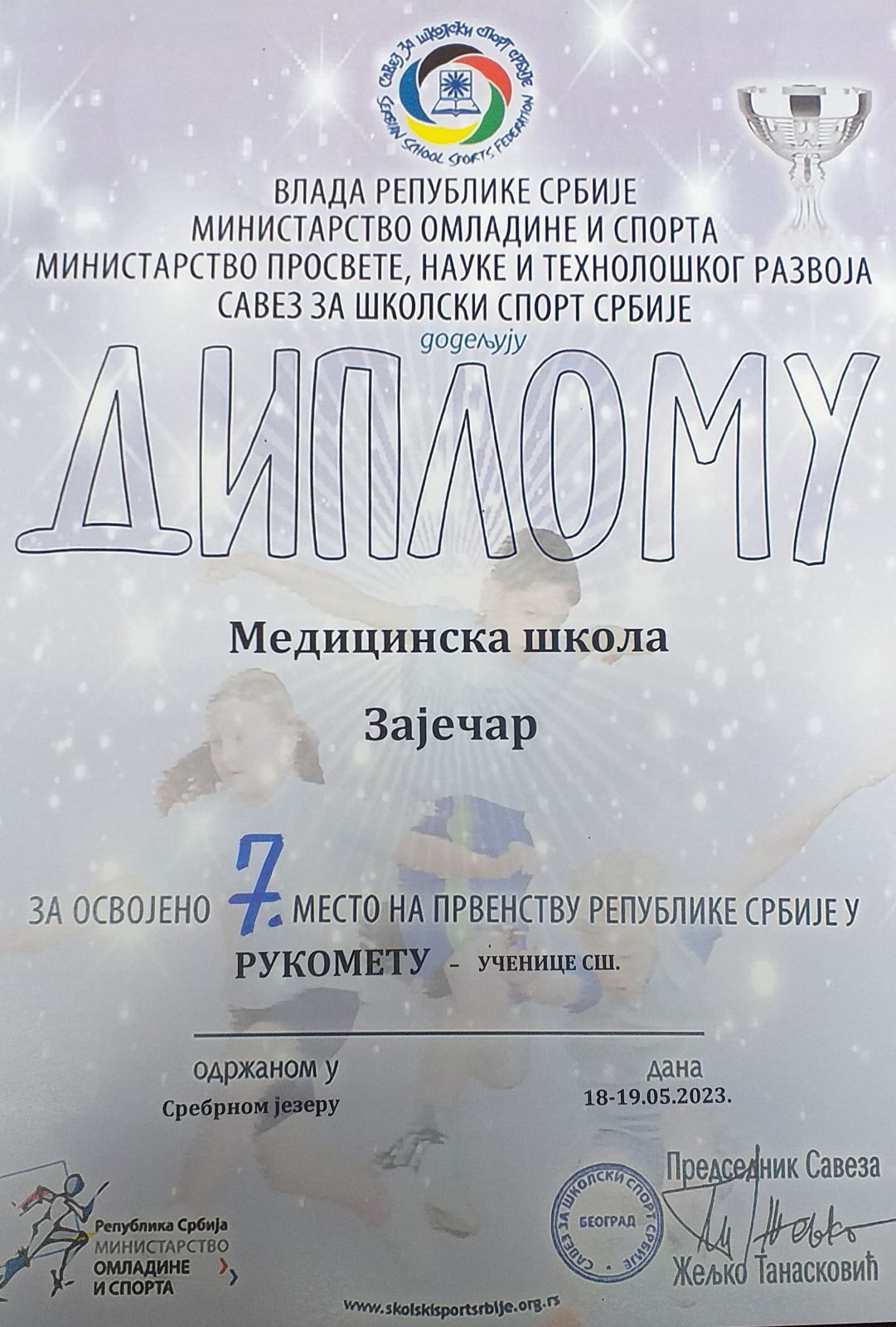 Женска екипа зајечарске Медицинске школе освојила је 7. место на Државном такмичењу у рукомету одржаном на Сребрном језеру 18. и 19. маја. Изабранице професорке Јелене Милосављевић поражене су у мечу за пласман од екипа из Аранђеловца 22:13 и Шапца резултатом 21:18. Зајечарке су завршно рукометно такмичење Савеза за школски спорт Србије завршиле на 7. позицији.